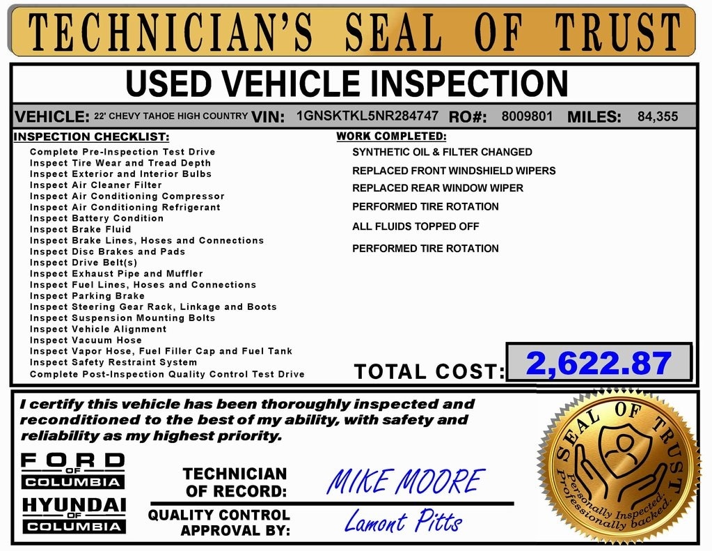 CARFAX One-Owner. Clean CARFAX. Tahoe High Country, 4D Sport Utility, 4WD, 15" Diagonal Multi-Color Head-Up Display, 1st & 2nd Row Color-Keyed Carpeted Floor Mats, 2-Speed Active Electronic AutoTrac Transfer Case, 3rd Row 60/40 Power-Folding Split-Bench Seat, Automatic Stop/Start, Bose 10-Speaker Centerpoint Surround Audio Sys Ft, Bright Front & Rear Door Sill Plates, Chrome Door Handles w/Body-Color Strip, Color-Keyed Carpeting Floor Covering, Driver & Front Outboard Passenger Airbags, Dual Exhaust System, Dual-Pane Power Panoramic Sunroof, Enhanced Driver Information Center, Floor Console, Hands-Free Rear Power Programmable Liftgate, HD Surround Vision, Heated 2nd Row Outboard Seats, Heated Steering Wheel, Hill Descent Control, Infotainment Display, Inside Rearview Auto-Dimming Rear Camera Mirror, Lane Change Alert w/Side Blind Zone Alert, Leather-Wrapped Steering Wheel, LED Daytime Running Lamps, Memory Settings, Outside Heated Power-Adjustable Mirrors, Power Release 2nd Row Bucket Seats, Power Tilt & Telescopic Steering Column, Preferred Equipment Group 3LZ, Rear Camera Mirror Washer, Rear Cross Traffic Alert, Rear Pedestrian Alert, Remote Start, Safety Alert Seat, SiriusXM Radio w/360L, Start/Stop System Disable Button, Universal Home Remote, Wireless Charging. Priced below KBB Fair Purchase Price!