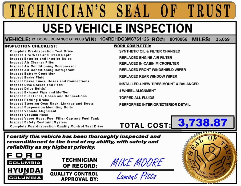 Durango GT Plus, 4D Sport Utility, RWD, 1-Year Trial (Registration Required), 10.1" Touchscreen Display, 115V Auxiliary Power Outlet, 180 Amp Alternator, 4G LTE Wi-Fi Hot Spot, 506 Watt Amplifier, 9 Alpine Amplified Speakers w/Subwoofer, Apple CarPlay, Black Roof Rails, Blacktop Package, Connected Travel & Traffic Services, Disassociated Touchscreen Display, Dual Remote USB Port - Charge Only, Exterior Mirrors w/Memory, Exterior Mirrors w/Supplemental Signals, For Details Visit DriveUconnect.com, Global Telematics Box Module (TBM), Gloss Black Badges, Gloss Black Exterior Mirrors, Google Android Auto, GPS Antenna Input, GPS Navigation, GT Gloss Black Badging, HD Radio, Heated Front Seats, Heated Second Row Seats, Heated Steering Wheel, Integrated Center Stack Radio, Integrated Roof Rail Crossbars, Integrated Voice Command w/Bluetooth, Leather Suede Bucket Seats, Power 6x9 Multi-Function Foldaway Mirrors, Power 8-Way Driver Memory 6-Way Passenger Seats, Power Driver/Passenger 4-Way Lumbar Adjust, Power Liftgate, Power Sunroof, Premium Group I, Quick Order Package 2BE GT Plus, Radio: Uconnect 5 Nav w/10.1" Display, Radio/Driver Seat/Mirrors Memory, Remote Start System, Satin Black Dodge Tail Lamp Badge, Security Alarm, SiriusXM Guardian - Included Trial (B), SiriusXM Satellite Radio, SiriusXM w/360L, Sun Visors w/Illuminated Vanity Mirrors, Tungsten Accent Stitching, Universal Garage Door Opener, USB Host Flip, Wheels: 20" x 8.0" Black Noise Aluminum. CARFAX One-Owner.