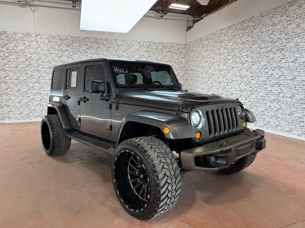 Clean CARFAX. Wrangler Unlimited Sahara 75th Anniverasry, 4D Sport Utility, 4WD, 2 Front & 1 Rear Bronze Tow Hook, 75th Anniversary Badge, Anti-Spin Differential Rear Axle, Black 3-Piece Hard Top, Body Color Grille w/Bronze Accent, Bronze Jeep Grille Badge, Bronze Steel Front Bumper, Bronze Steel Rear Bumper, Bronze Trail Rated Badge, Chrome/Leather Wrapped Shift Knob, Connectivity Group, Delete Sunrider Soft Top, Driver Height Adjuster Seat, Dual Top Group, Freedom Panel Storage Bag, Heated Front Seats, Hood w/Power Dome, IP Grab Handle w/75th Anniversary Logo, Jeep 75th Anniversary Package, Leather Seat w/Cloth (Ombre Mesh) (DISC), Low Gloss Black Wrangler Decal, MOPAR Slush Mats, Moroccan Sun Instrument Panel Bezel, Moroccan Sun Interior Accents, Premium Black Sunrider Soft Top, Quick Order Package 24H 75th Anniversary (DISC), Radio: 430 (DISC), Rear Window Defroster, Rear Window Wiper/Washer, Remote USB Port, Sunrider Soft Top, Tire Pressure Monitoring Display, Uconnect Voice Command w/Bluetooth, Vehicle Information Center, Wheels: 17 x 7.5 Aluminum Bronze (DISC). Odometer is 19649 miles below market average!